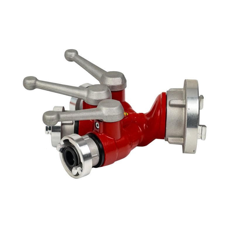Der Kindswater Kugelhahnverteiler C-DDD aus Aluminium verteilt Löschwasser zuverlässig von einer C-Zuleitung auf drei D-Abgänge.