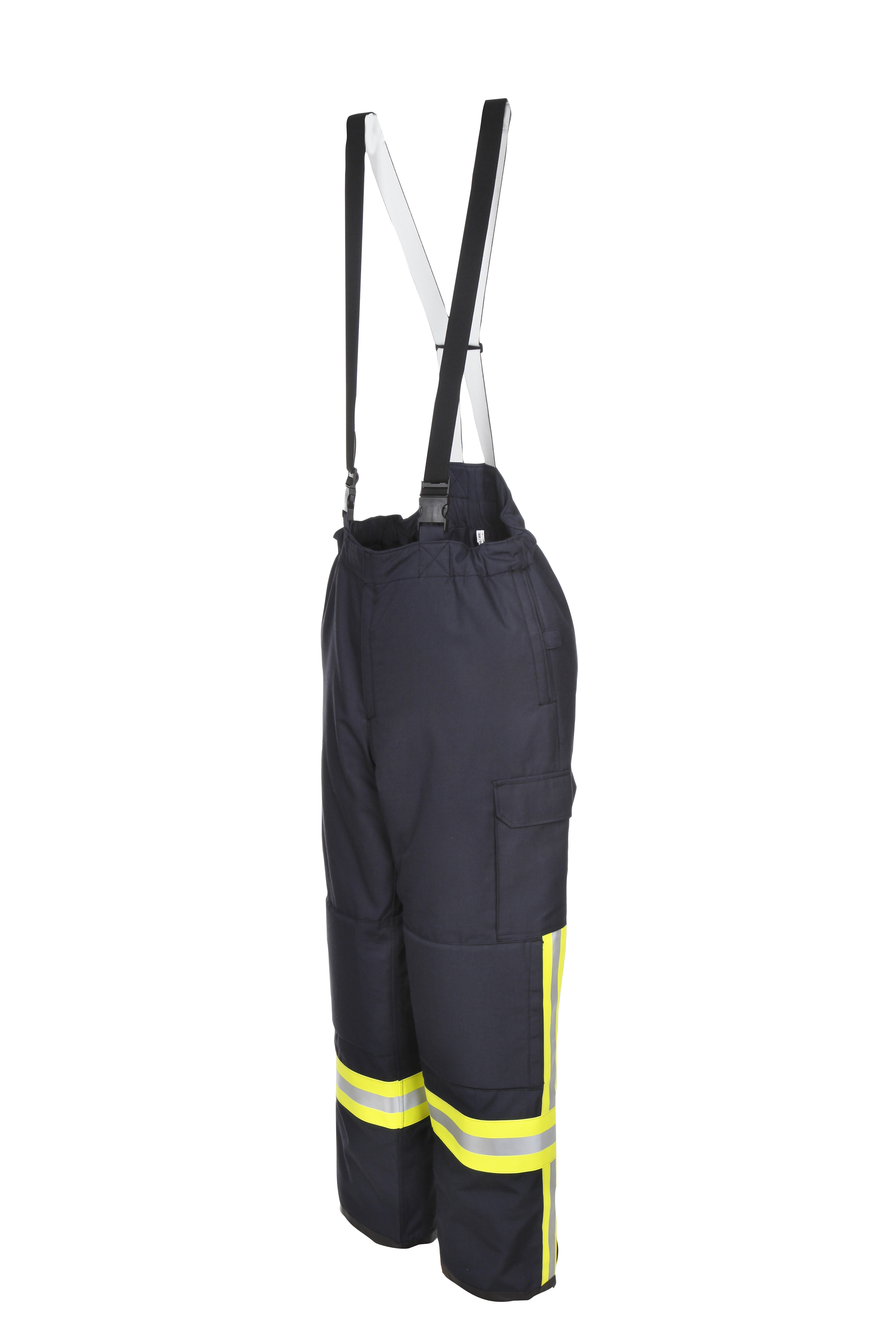 Feuerwehr-Überhose Typ B Farbe ROT EN 469:2005/2007 4-lagig NOMEX Comfort mit AIRTEX-S Nässesperre, dunkelblau. Kniepolster: auswechselbare FL-Platte. Verstellbare Hosenträger, verlängerte Hinterhose, Bund weitenverstellbar, Fußweite mittels Reißverschluss verstellbar, Hosenbein-Saum mit Nässesperre, mit Messertasche. Reflexstreifen 3M gelb/ silber/ gelb längs und quer. EN 469:2005/07 LS X2 Y2 Z2. Ausstattung nach HuPF Teil 4 Typ B 08.99. Größen 0-IV /Kein ÜG-Zuschlag