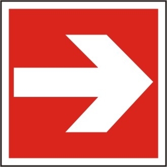 Brandschutzzeichen Richtungsangabe rechts/links, ISO 7010, Folie, Grund rot, Symbol und Rand weiß, Format: LxH 150 x 150 mm. (Nur in Verbindung mit einem anderen Brandschutzzeichen erlaubt.