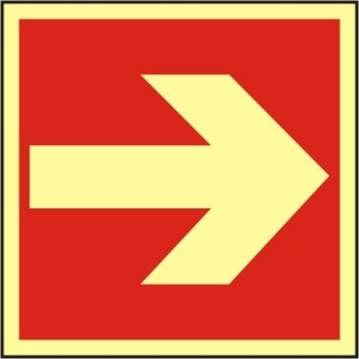 Brandschutzzeichen Richtungsangabe rechts/links, ISO 7010, Kunststoff nachleuchtend selbstklebend, Grund rot, Symbol und Rand gelb, Format: LxH 200 x 200 mm. (Nur in Verbindung mit einem anderen Brandschutzzeichen erlaubt.)