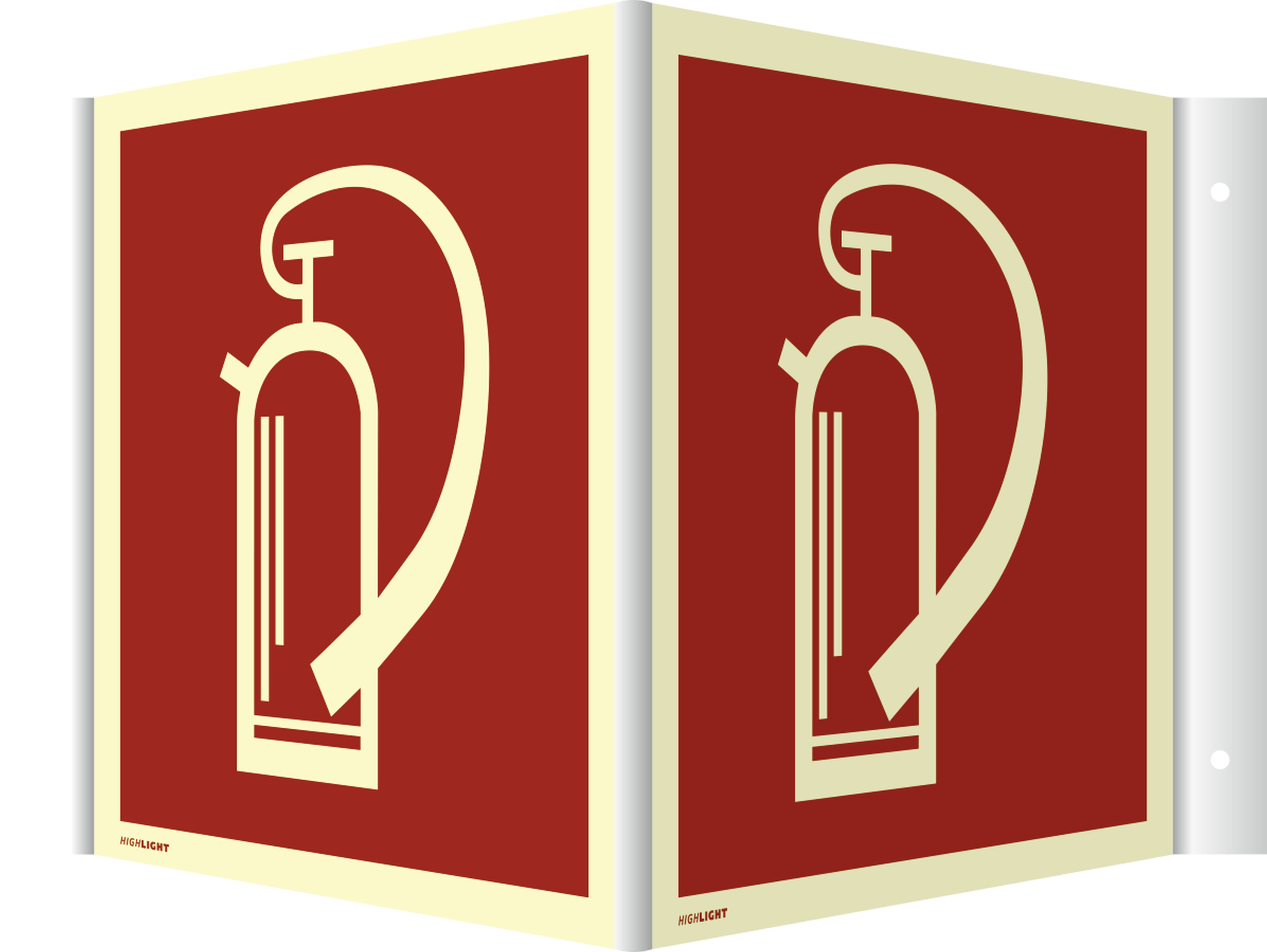 Brandschutzzeichen Feuerlöscher, Nasenschild, auf 2 Seiten bedruckt, alte ASR A1.3 (2007), BGV A8, F05, Kunststoff langnachleuchtend, Grund rot, Symbol und Rand gelb. Format: LxH 150 x 150 mm.