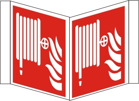 Brandschutzzeichen Löschschlauch, Nasenschild, auf 2 Seiten bedruckt, ISO 7010 F002, Kunststoff, Grund rot, Symbol und Rand weiß, Format: LxH 200 x 200 mm.
