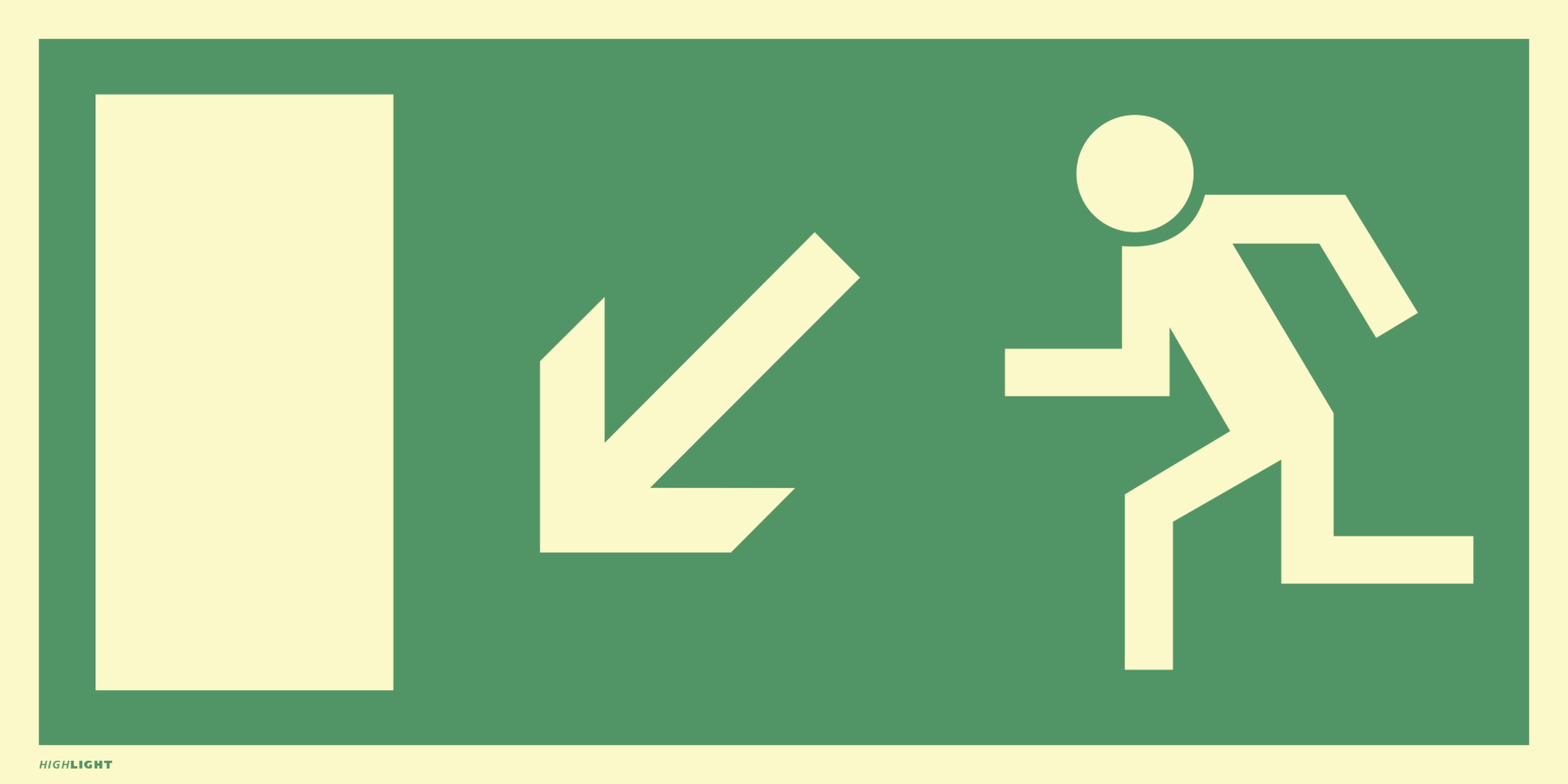 Rettungszeichen Rettungsweg links abwärts, BGV A8, E13, Folie selbstklebend langnachleuchtend, Grund grün, Symbol und Rand gelb. Format: LxH 400 x 200 mm.