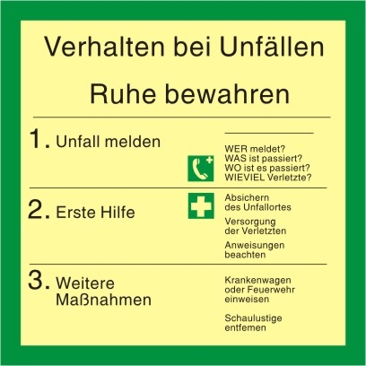 Sicherheitsaushang Verhalten bei Unfällen 200x200mm Kunststoff-Nachleuchtend-Selbstklebend ISO 7010