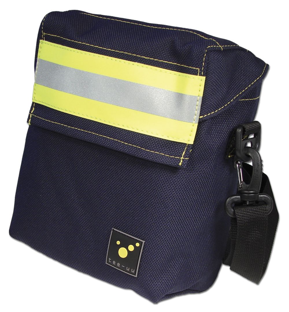 PROFI Atemschutz-Holstertasche mit 3 Innenfächern, geeignet zur Bestückung mit Rettungsmesser, Bandschlinge, Karabinerhaken, Kennzeichnungsstift bzw. Wachskreide u.ä., außen 2 Elastik-Schlaufen für 2 Holzkeile (Bestückung nicht im Lieferumfang), Holster aus hochabriebfestem, widerstandsfähigem Gewebe schwarz-blau mit Reflexstreifen gelb-silber-gelb 5 cm breit, 2 Halteschnüre ca. 40 cm mit Karabiner sichern den Verlust der Bestückung, Rückseite mit Vario-Doppel-Klettverschluß, HxBxT 150x125x60 mm, Material: 370G TEC Fire Retardant
