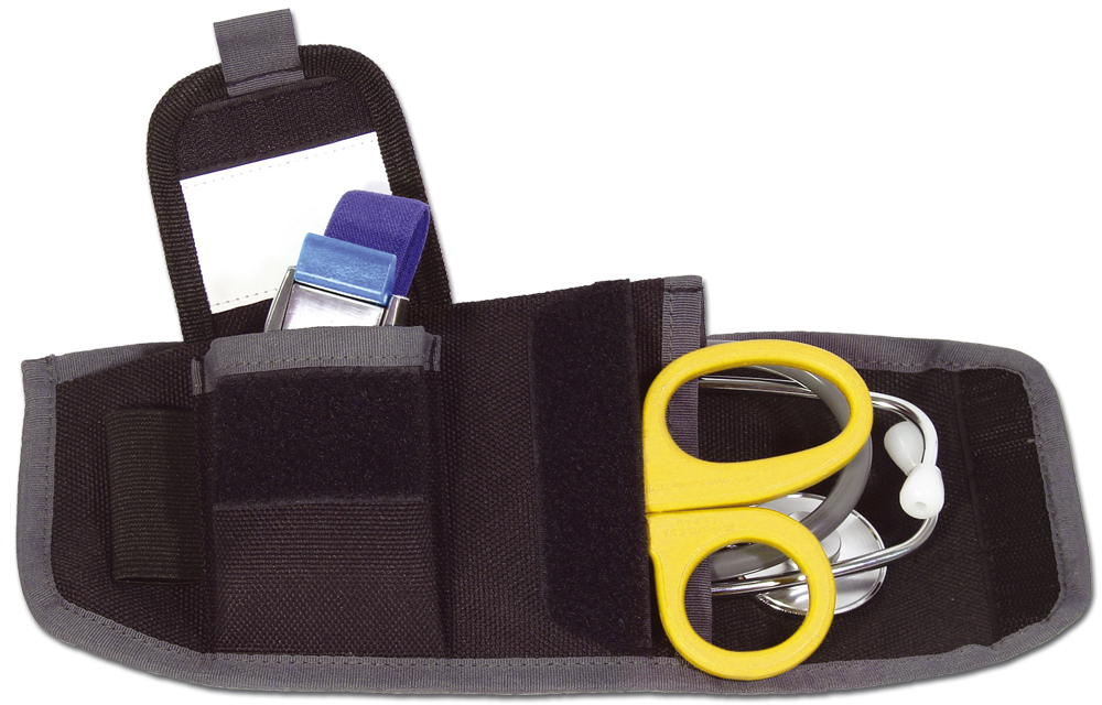 CARDIO Stethoskop-Holster, Rettungsdienst-Spezialholster zur geschützten Lagerung eines Stethoskops. Zusätzlich lässt sich eine Kleiderschere in einem separaten Fach unterbringen. Die aufgesetzte Fronttasche mit Deckel bietet Raum z.B. für den Funkmeldeempfänger oder Kleinteile. Eine Elastikschlaufe auf der Außenseite bietet Platz z.B. für eine Stablampe oder einen Holzkeil. Der schnelle Zugriff auf Infektions-Schutzhandschuhe ist dank dem integrierten GLOVE-FIX System gewährleistet. Die Handschuhe werden dabei kompakt und sicher vor Beschädigung (z.B. durch einen Reißverschluss) verstaut. Koppel oder Gürtel lassen sich sowohl vertikal als auch horizontal durch die Trageschlaufen auf der Rückseite führen. Die gepolsterte Rückseite gewährt sowohl einen angenehmen Tragekomfort als auch den Schutz des innenliegenden Stethoskops. Material: 1200D Polyester, nicht flammfest