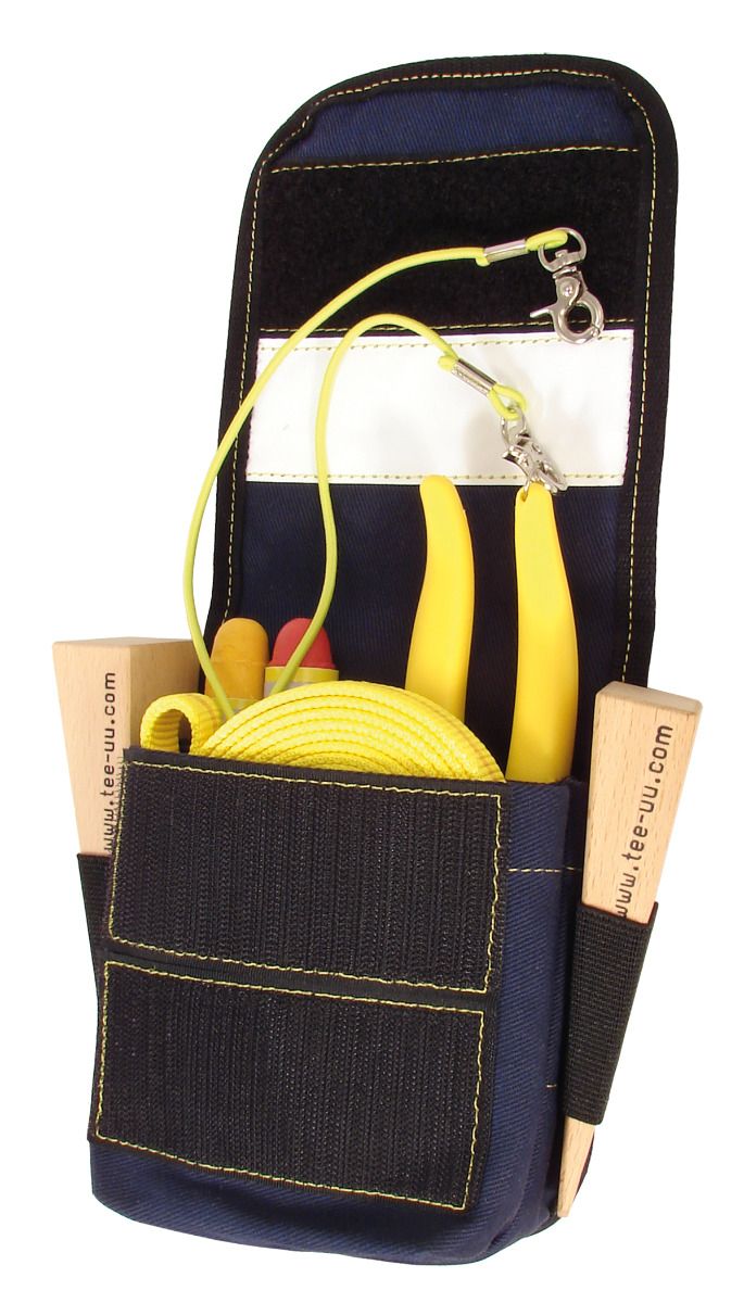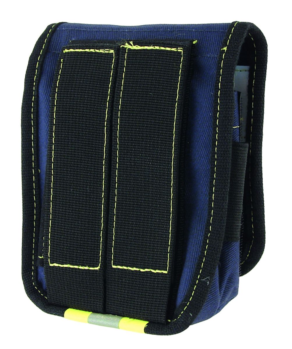 PROFI Atemschutz-Holstertasche mit 3 Innenfächern, geeignet zur Bestückung mit Rettungsmesser, Bandschlinge, Karabinerhaken, Kennzeichnungsstift bzw. Wachskreide u.ä., außen 2 Elastik-Schlaufen für 2 Holzkeile (Bestückung nicht im Lieferumfang), Holster aus hochabriebfestem, widerstandsfähigem Gewebe schwarz-blau mit Reflexstreifen gelb-silber-gelb 5 cm breit, 2 Halteschnüre ca. 40 cm mit Karabiner sichern den Verlust der Bestückung, Rückseite mit Vario-Doppel-Klettverschluß, HxBxT 150x125x60 mm, Material: 370G TEC Fire Retardant