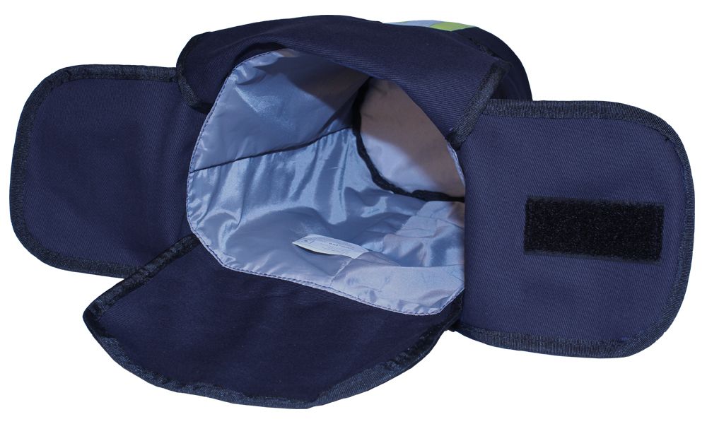 RESPI LIGHT XL Atemschutzmasken-Tasche. Farbe blau. Für große Masken mit Kommunikationseinheit. Gelungene Kombination aus kompakter Bauform mit Platz für große Atemschutzmasken mit Kommunikationseinrichtung und geringem Platzbedarf im Fahrzeug. Formflexible Tasche mit teilgepolstertem Maskenfach. Innovatives Tragesystem mit stufenlos verstellbare Dual-Trageriemen. Tasche mit Beschriftungsfeld innen und außenliegendem (Visiten-) Kartenfach. Waschbar bei 40°C. Material: 95% Cotton / 5% Meta-Aramid, flammfest. Maße: 250 mm Ø x 180 mm. Gewicht 295 g