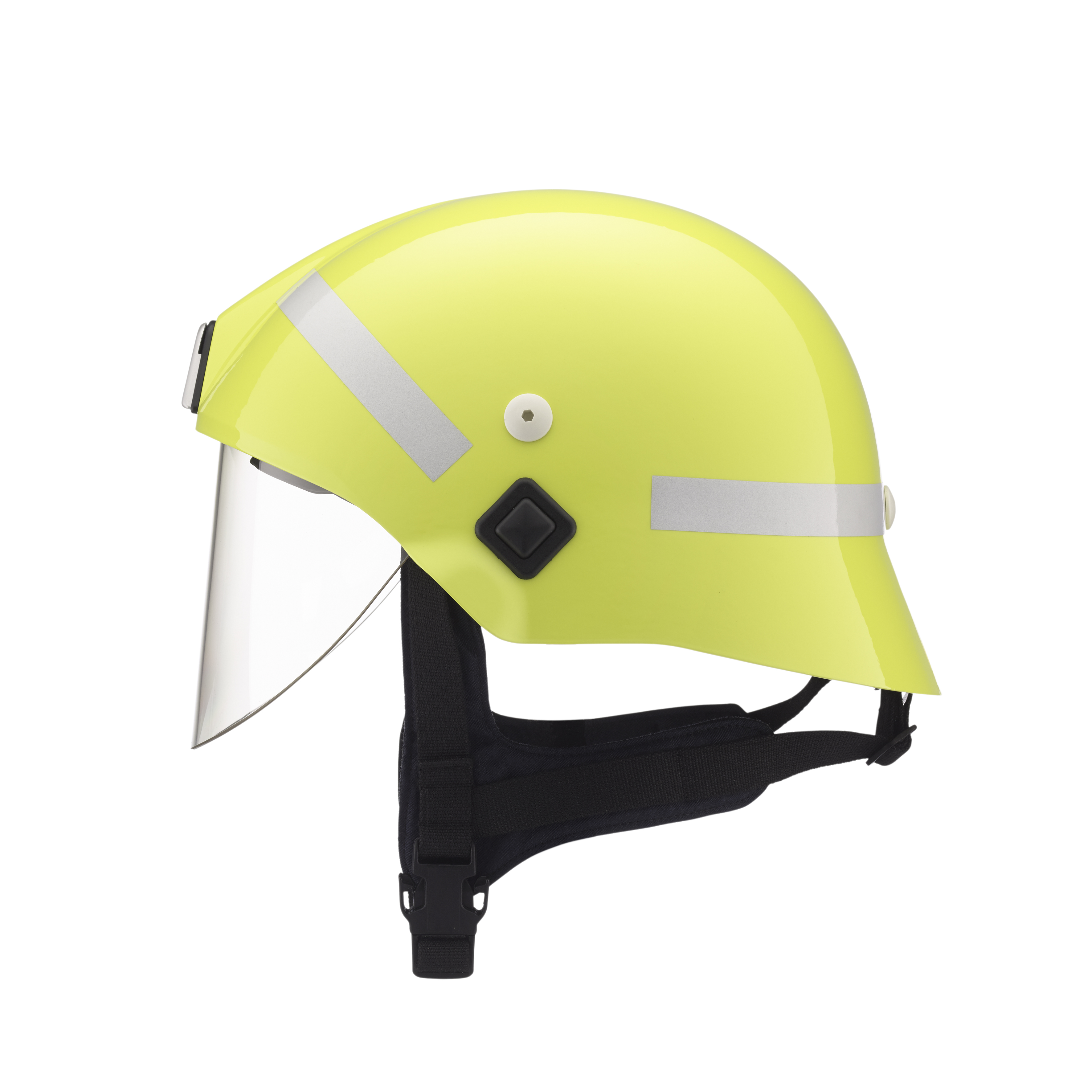 Feuerwehrhelm F 220 nach EN 443:2008 mit Drehverschluss, schwefelgelb RAL 1016, mit umlaufendem Reflexband in silber, aus hochtemperaturbeständigem Duroplastmaterial, hochtemperaturbeständige PU-Innenschale, Innenausstattung mit Tragenetz ermöglicht einen hohen Tragekomfort, 3-Punkt-Kinn-Nackenriemen, integriertes Visier aus Kunststoff nach EN 14458, Helmgröße verstellbar von Gr. 53 bis 64 cm, Typ A (Halbschale) Gewicht ca. 1,15 kg