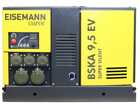 Stromerzeuger BSKA 9,5 EV SS curve VARIOSPEED / SUPER-SILENT EISEMANN DIN 14685-1, E-Start inkl. Starterbatterie, im 8-er DIN-Rahmen, gelb, mit leistungsabhängiger Drehzahlabsenkung VARIOSPEED, mit 3-Wege-Hahn zur Fremdbetankung, Isolationsüberwachung nicht abschaltend. Bürstenloser, wartungsfreier Synchrongenerator mit hohem Anlaufstrom, Dauerleistung 9,5 kVA, Schutzart IP 54. Antriebsmotor B&S 305447 2 Zyl. 4 Takt-Benzin, Motorleistung 10,5 kW, Tankinhalt 12 l. Schalldämmung vollgekapselt mit Schallleistungspegel 93 dB (A). Ausstattung mit 3x Schuko-Steckdosen 230 V/ 16 A nach DIN 49442 und 2x CEE Steckdose 400 V, 16 A, Sicherungsautomat, Betriebsstundenzähler, Bordwerkzeug etc, Maße 820x440x580 mm. Gewicht mit Batterie ca. 150 kg