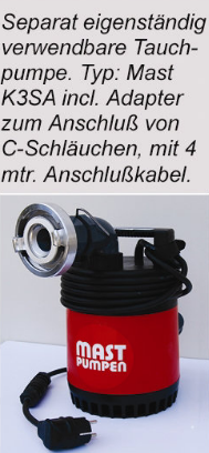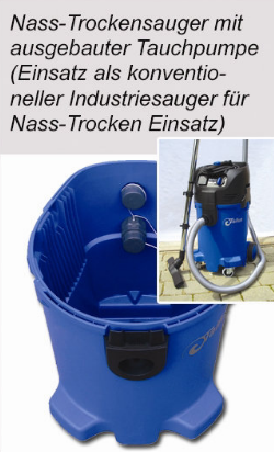Feuerwehr-Wassersauger Taifun 200 AE, Industriesauger mit eingebauter Tauchpumpe für permanentes Saugen und gleichzeitiges Entleeren (AE) des Behälters z.B.über C-Schlauch."3 Geräte in einem" Wassersauger mit permanenter Entleerung (AE), konventioneller Industriesauger mit eingebauter Tauchpumpe, separat eigenständig verwendbare Tauchpumpe.
