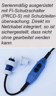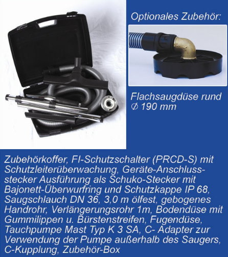 Lieferumfang: FI-Schutzschalter (PRCD-S) mit Schutzleiterüberwachung, Geräte-Anschlusstecker Ausführung als Schuko-Stecker mit Bajonett-Überwurfring und Schutzkappe IP 68, Saugschlauch DN 36, 3,0 m ölfest, gebogenes Handrohr, Verlängerungsrohr 1m, Bodendüse mit Gummilippen u. Bürstenstreifen, Fugendüse, Tauchpumpe Typ K 3 SA, C- Adapter zur Verwendung der Pumpe außerhalb des Saugers, C-Kupplung, Zubehör-Box