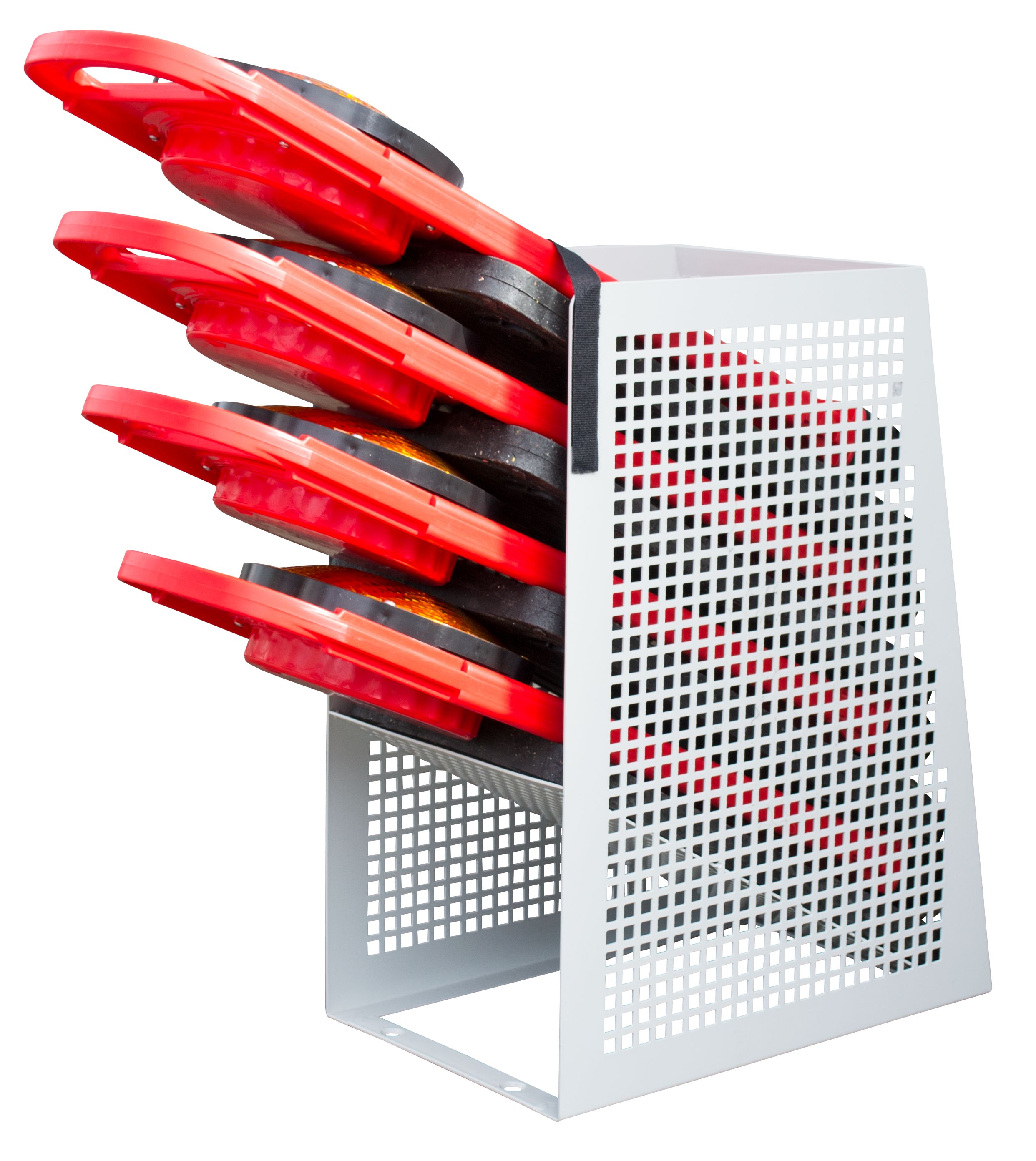 Transport- / Lagerbox für 6 Warnmax oder 4 FlashMax oder FlashMax Synchro. Zum Einbau in Fahrzeuge. Metallbox mit Lochblech, kunststoffbeschichtet. Farbe RAL 7035 lichtgrau. Maße (LxBxH): 430 x 260 x 560 mm, Gewicht ca. 7,00 kg. Auflageblech steiler.