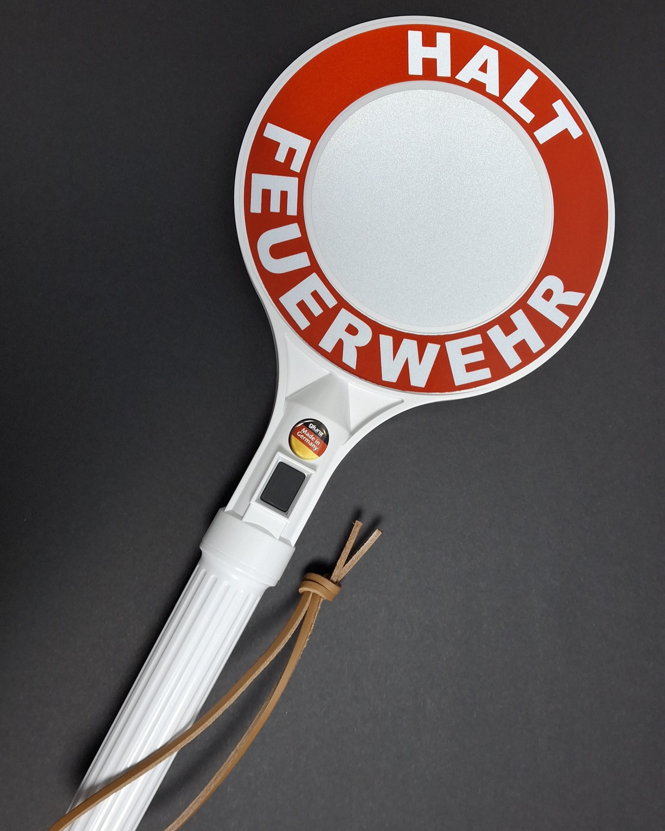 Feuerwehr-Einsatzstab unbeleuchtet, beidseitig rote Streifen, mit beidseitiger Aufschrift HALT FEUERWEHR auf rotem Grund, aus schlagfestem Kunststoff, ca. 450 mm lang, Signalscheibe ca. 200 mm Ø, Lederschlaufe, Gewicht ca. 400 g