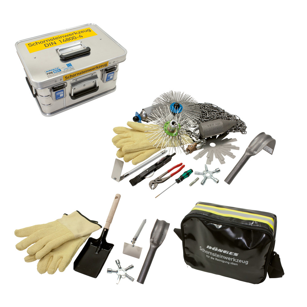 Schornstein-Werkzeugkasten DIN 14800-4-SSWK, komplett im DIN 14800-2-LM Leichtmetallkasten untergebracht. Kasten mit Alu-Einteilung sowie mit der Aufschrift "Schornsteinwerkzeug".Inhalt: Tasche für Reinigung oben, Fallgranate 4 kg, Kugelschlagapparat komplett, Kette 20 m oder Kette 30 m Leinstern mittelhart 250 mm Kratzfedereinlage 160 mm Kratzfedereinlage 200 mm Kratzfedereinlage 240 mm Schultereisen kurz (2 Stück) Sternschlüssel (2 Stück) Hitzeschutzhandschuhe (1 Paar) Kaminspiegel mit Teleskopgriff (2 Stück) Federstahlstange 3 m (2 Stück) Rollenöffner Stossbesen mit Gewinde 250 mm (2 Stück) Wasserpumpenzange 240 mm Schlitzschraubendreher Kohlenschaufel Maße (LxBxH): 400 x 300 x 220 mm Gewicht: ca. 21,00 kg